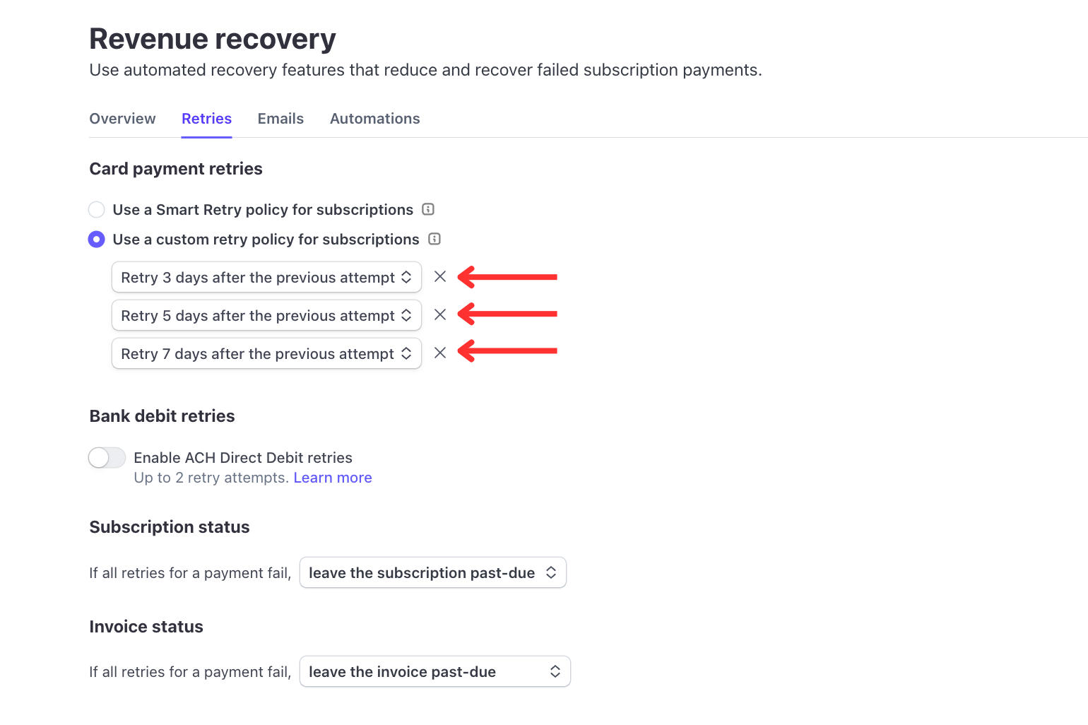 1) In Stripe, navigate to Revenue Recovery > Retries